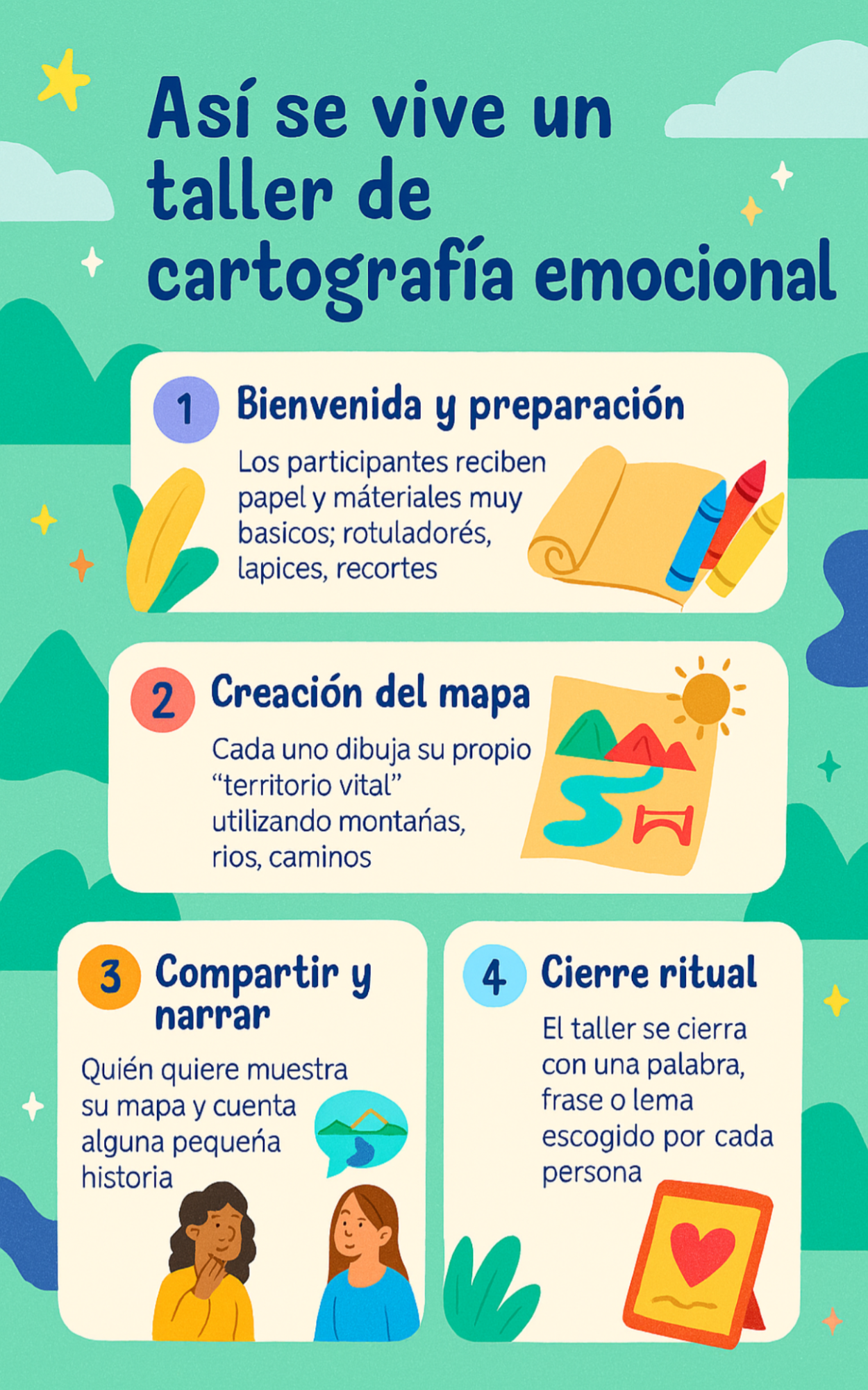 Un taller de cartografía emocional suele ser una experiencia sencilla y muy humana. No hace falta saber dibujar ni tener conocimientos previos, solo ganas de dejarse llevar.